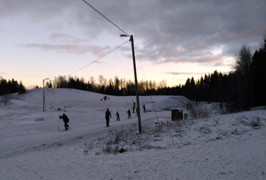 Samoin Keravan Keinukalliolla on jo hyvät hiihto-olosuhteet, Hakunilan tapaan niin perinteiseen kuin luisteluhiihtoon. Keinukallion tykkilumilatu oli sunnuntaina 900 metriä ja vilskettä riitti lapsista aikuisiin. Kaksi lumitykkiä tekivät koko ajan lisää lunta.